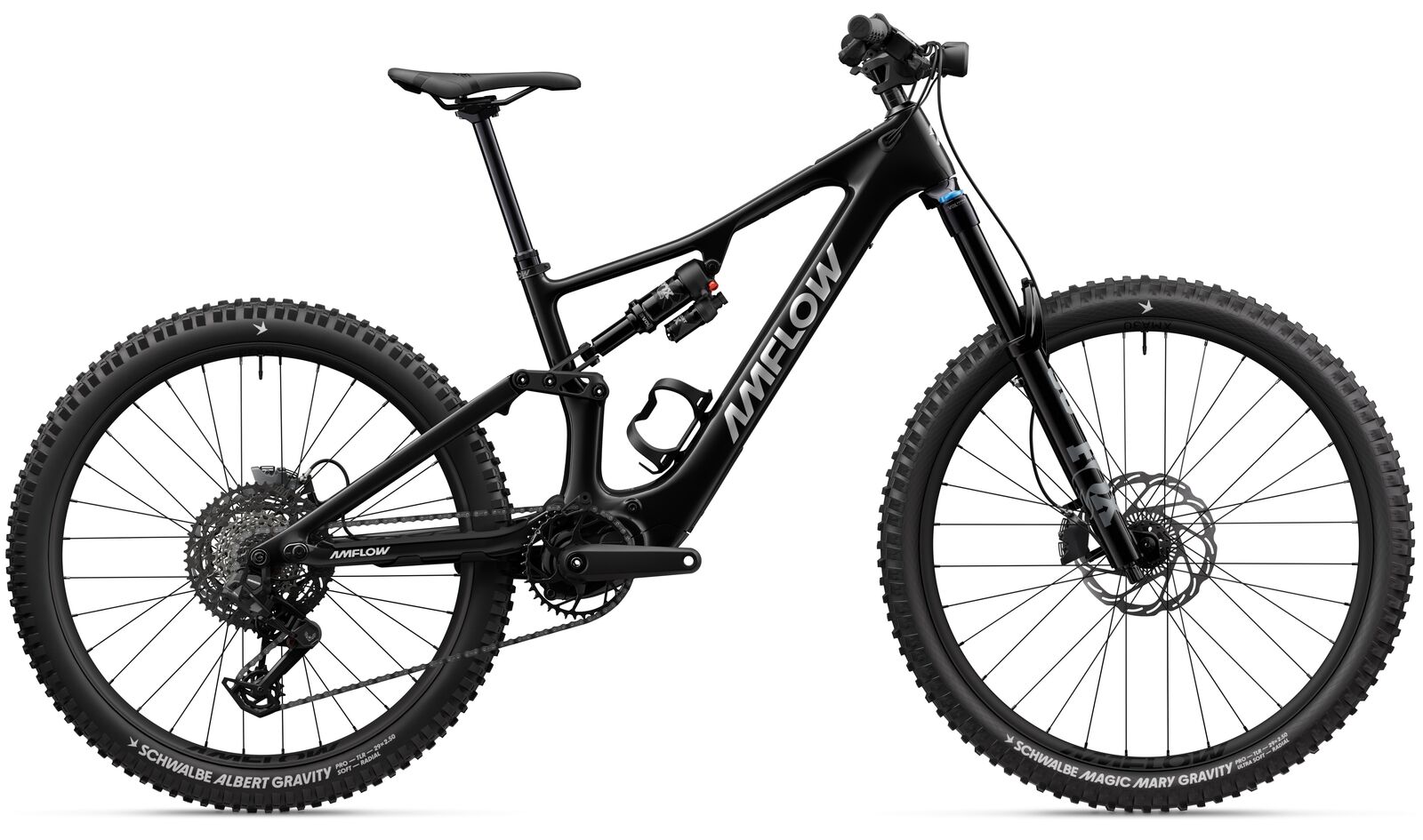| Description | The Amflow PX Carbon is a high-performance trail e-MTB designed to deliver confidence, capability, and adaptability across a wide range of terrain. Built around a lightweight carbon frame and a proven component package, it offers an ideal balance of performance and value. Key FeaturesCarbon frame with 40 adjustable geometry configurations FOX 36 Performance fork & Float X Performance shock SRAM S1000 Eagle Transmission drivetrain 700Wh integrated battery with Avinox system Alloy mullet wheelset (29- ? front / 27.5- ? rear) Trail-Ready PerformanceWith 160mm travel from FOX suspension and a progressive geometry platform, the PX Carbon is built to handle demanding trails while remaining composed and predictable. The mullet wheel setup enhances agility without compromising stability. Reliable Drivetrain & PowerThe SRAM S1000 Eagle Transmission delivers smooth, precise shifting under load, while the 700Wh Avinox battery ensures long-range capability. Combined with intuitive controls and a clean integrated system, this bike is built for all-day riding. FramesetFrame: Amflow PX Carbon Frame, Phantom Black, 40 adjustable geometry configurations, compatible with 27.5- ? and 29- ? rear wheels Fork: FOX 36 Performance (MY 2027), 160mm travel, GRIP damper, Sweep/LSR adjustment, 15? - 110mm, 44mm offset Rear shock: FOX Float X Performance (MY 2027), 2-position lever, custom tune, LSR adjustment, 210? - 55mm, air shock E-bike SystemDisplay: Avinox Screen, 2-inch OLED Control Display Battery: Avinox Integrated Battery, 700Wh Controllers: Avinox Wireless Controllers, right and left sides Charger: Avinox Fast Charger, 12A/508W Drivetrain and brakesRear derailleur: SRAM S1000 Eagle Transmission Derailleur Chainring: SRAM Eagle Transmission DM Chainring, 38T for Avinox Shift levers: SRAM AXS Pod Controller Cassette: SRAM XS-1270 Eagle Transmission Cassette, 10-52T Chain: SRAM Eagle 70 Transmission Flattop Chain Power supply: Avinox M2 Series Electronic Rear Derailleur Power Cable Crankset: Avinox SL Crank (M/L: 155mm; XL/XXL: 160mm) Front brake: Magura Gustav Pro Hydraulic Disc Brake, 4-piston calipers Rear brake: Magura Gustav Pro Hydraulic Disc Brake, 4-piston calipers Brake rotors: Magura Sensor Rotor (203mm, 2.5mm) Brake mount: Amflow Dropper Remote Lever Mounting Bracket CockpitHandlebar: Amflow Enduro Alloy Handlebar, 40mm rise, 800mm width, 35mm diameter, 5-degree upsweep, 9-degree backsweep Grips: Amflow Enduro Grip 2 Lock-on Grips Stem: Amflow Mountain Bike Split Stem, 35mm length, 35mm clamping diameter WheelsWheelset: Amflow XMA-30 Mullet Version Front rim: Alloy, 29- ?, 30mm inner width, 32H, tubeless ready Rear rim: Alloy, 27.5- ?, 30mm inner width, 32H, tubeless ready Spokes: SAPIM E-Light Front hub: Alloy, 2 sealed bearings, 15? - 110mm thru-axle, 32H, 6-bolt Rear hub: Alloy, 4 sealed bearings, 12? - 148mm thru-axle, 32H, 6-bolt, 4 pawls, 36T, HG Front tyre: Schwalbe Magic Mary, 29? - 2.5 Gravity Pro, Radial Rear tyre: Schwalbe Albert, 27.5? - 2.5 Gravity Pro, Radial Other partsSaddle: Amflow Mountain Saddle Dropper post: Amflow Dropper Post Shim (adjustable travel: 0/5/10/15/20/25mm), M/L frame: 190mm, XL frame: 210mm, XXL frame: 230mm Front light: Avinox Front Light Rear light: Rear Light Bottle cage: Amflow Bottle Cage Geometry systems: Three Geometry Adjustment Systems Dropper spacers: 5/10mm Dropper Post Travel Reducing Spacer Torque wrench: Included Frame protection: Clear Frame Protection Film Shock pump: Included Guide: Quick Start Guide SIM card: IoT Nano SIM Card |